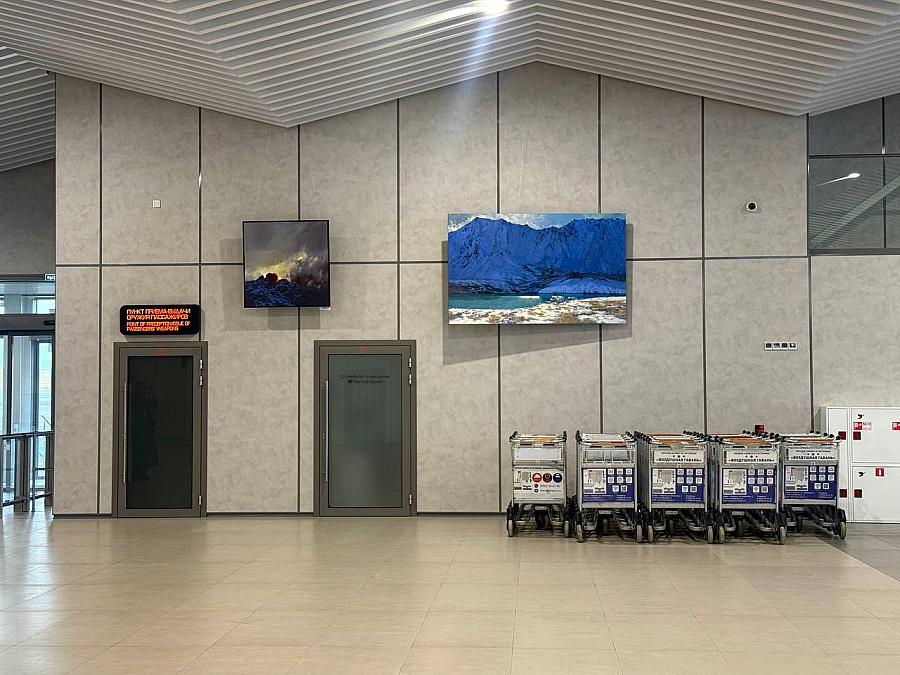 Остальные работы художника встречают пассажиров в зоне выдачи багажа. Они создают особое пространство, наполняя время ожидания атмосферой живого дыхания природы: холодным блеском льда, таёжной тишиной, сиянием снега и бескрайних небес.