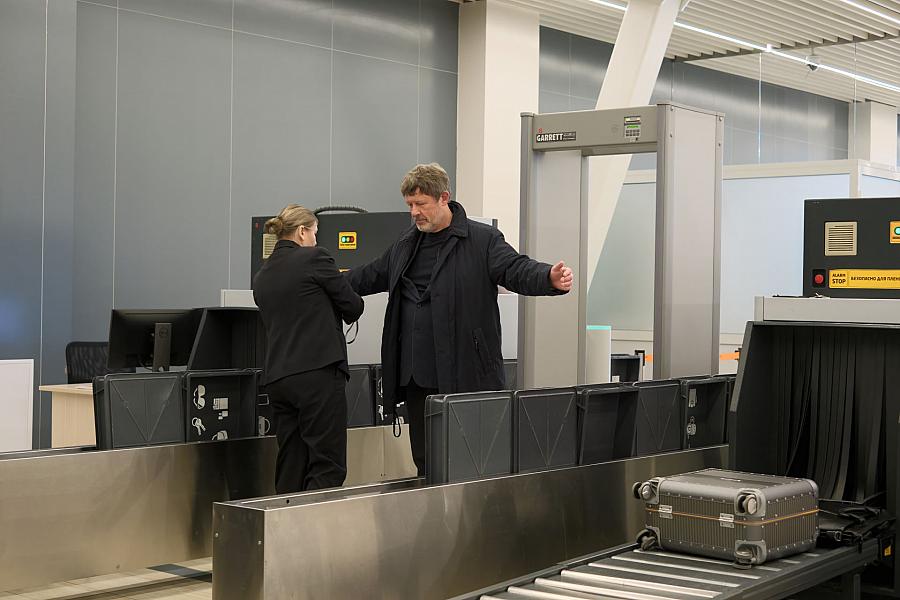 Первой точкой маршрута стала зона входного досмотра, где участникам форума представили результаты проекта по повышению производительности, завершённого в декабре 2024 года. Перепланировка размещения интроскопов и металлодетекторов позволила открыть третью линию досмотра на постоянной основе, а удлинённые роликовые дорожки вывода багажа из интроскопов сократили время обработки вещей с 94 до 83 секунд — на 12%. Выделенная линия для маломобильных пассажиров обеспечила более комфортный досмотр без смешения с общим потоком. В результате максимальное время ожидания в очереди сократилось с 16 до 6 минут, а пропускная способность выросла с 240 до 320 пассажиров в час — на 33%.