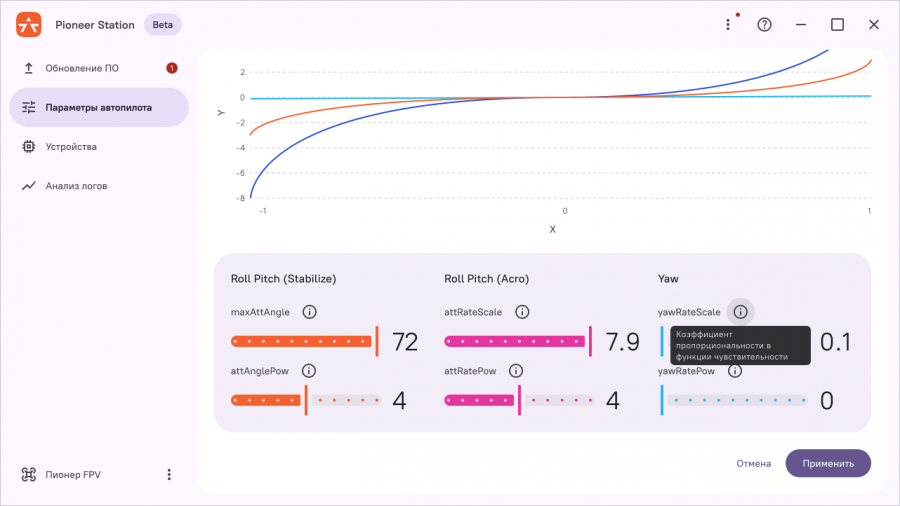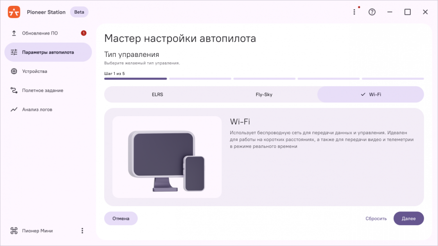 Ключевым нововведением Pioneer Station 2.0 стал мастер настройки автопилота. Он ведет пользователя по шагам и позволяет выбрать тип управления, задать систему навигации, а также настроить скорости полета. За счет этого коптер предсказуемо ведет себя в воздухе даже у начинающих пользователей. Мастер помогает быстрее перенастраивать учебные дроны под разные задачи и снижает риск ошибок в полете.