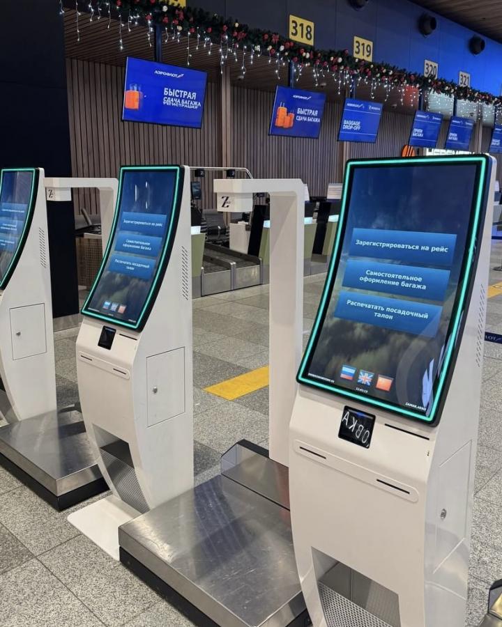 Пассажиры с багажом могут зарегистрироваться, распечатать посадочный талон и багажную бирку. После этого можно самостоятельно сдать багаж на специальной стойке рядом с киоском.