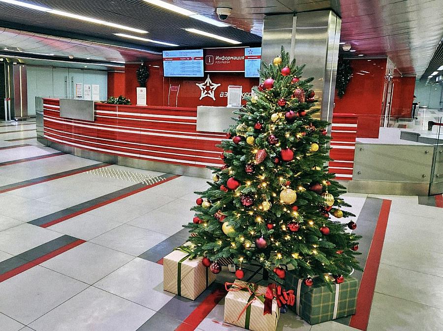 Пассажирские зоны украшены гирляндами, хвойными ветвями и нарядными ёлками, звучит тематическая фоновая музыка.