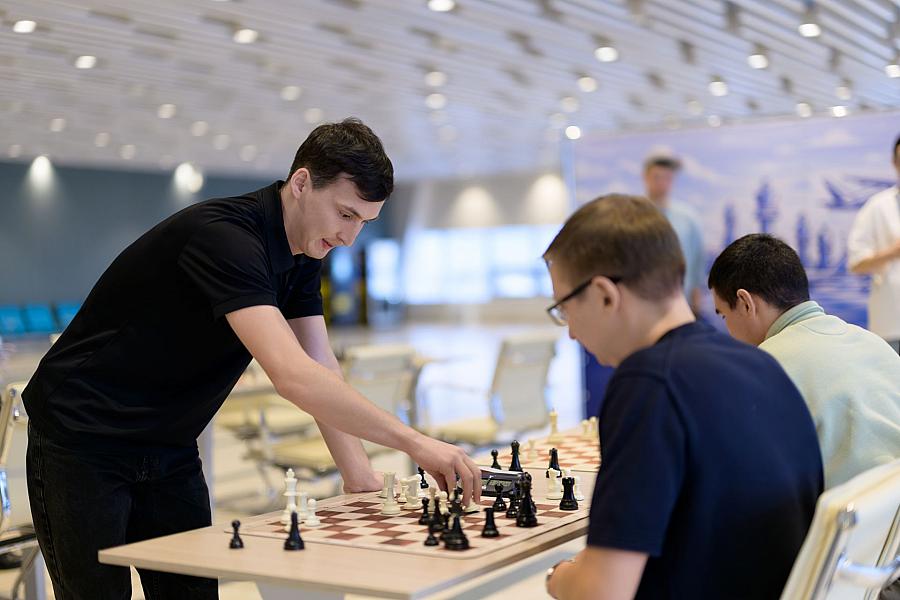 Трёхкратный чемпион Сахалинской области Артём Хуснулгатов провёл сеанс одновременной игры на четырёх досках — и со взрослыми, и с детьми. Артём — сын сотрудника авиакомпании «Аврора», так что турнир авиаторов стал для него семейным событием. Все партии завершились победой чемпиона.