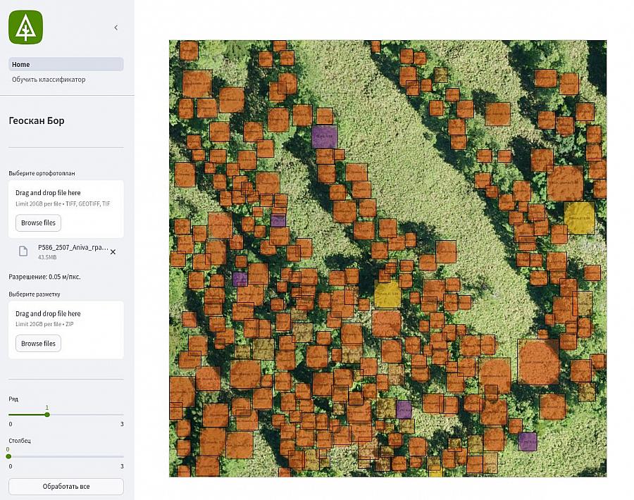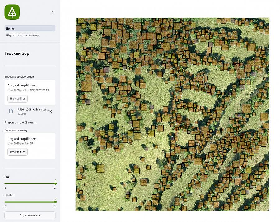 Для аэрофотосъемки использовалась БАС «Геоскан 201». Фотограмметрическая обработка велась в Agisoft Metashape, а классификация и подсчет растительности выполнялись в разработанном Геосканом программном комплексе «Бор», который использует нейросетевые технологии. Алгоритмы искусственного интеллекта выявили отдельные деревья, определили породы, рассчитали высоты и диаметры, выделили реальные границы участков и классифицировали растительность по категориям. Общая площадь проанализированного участка превысила 860 га.