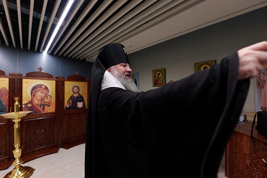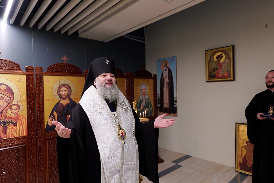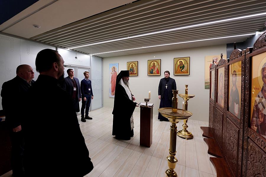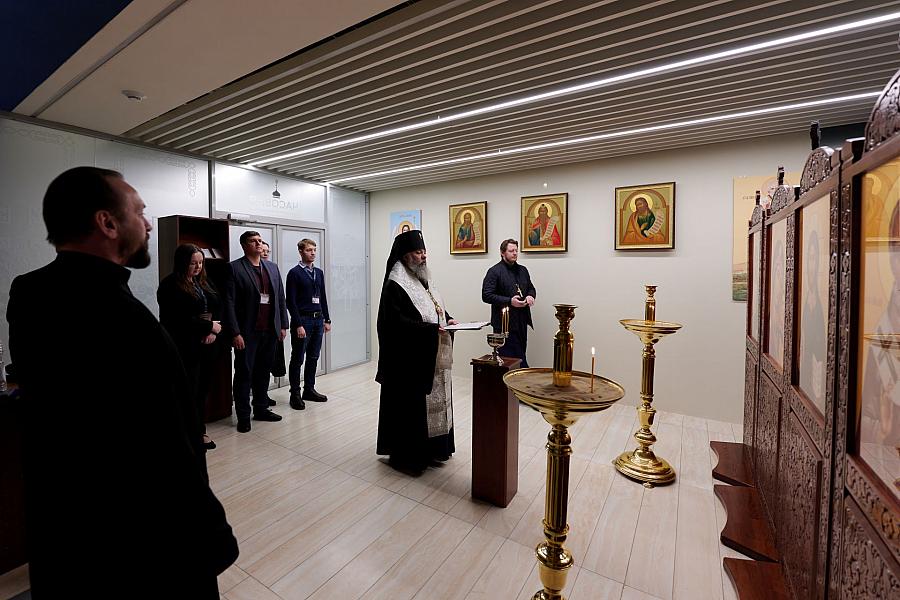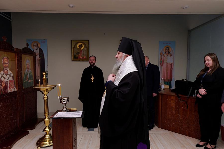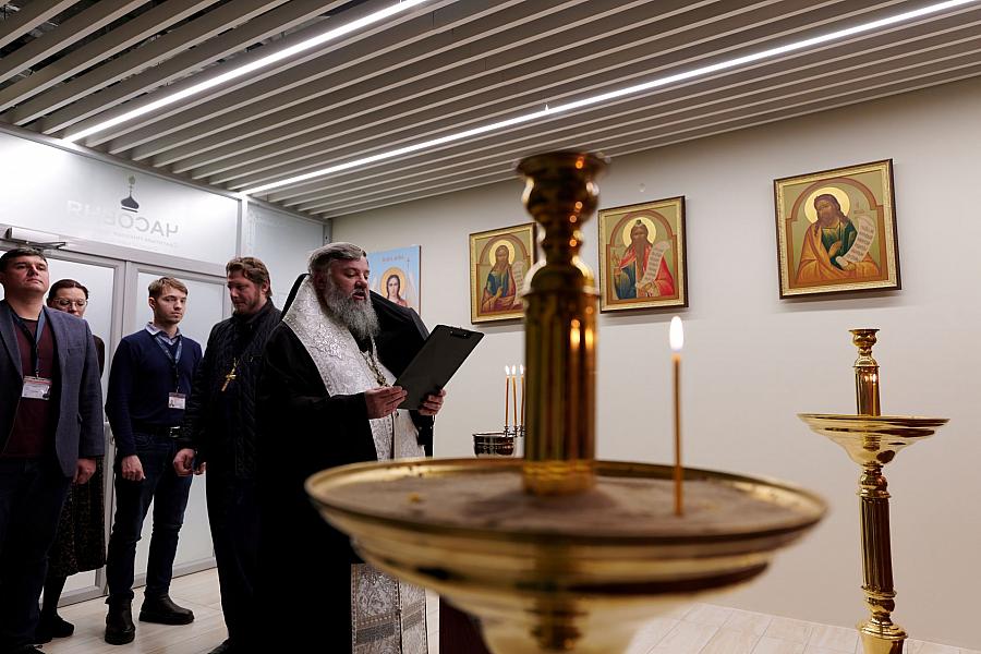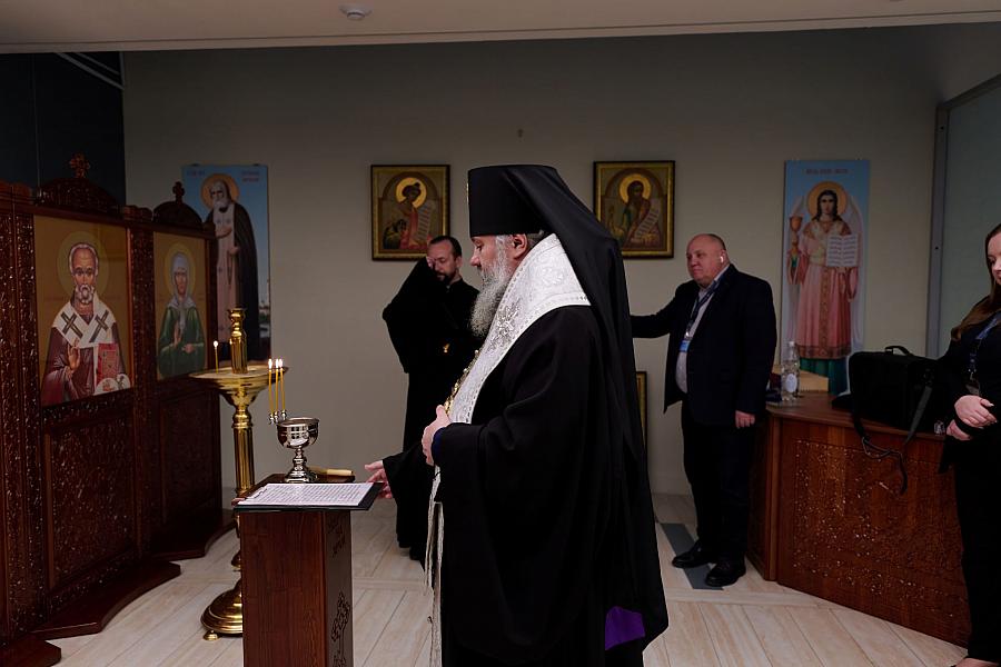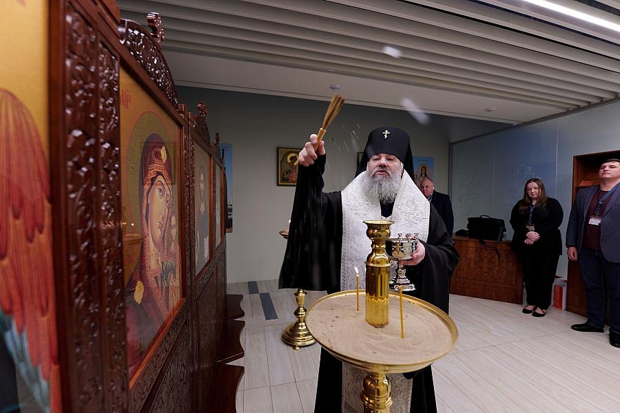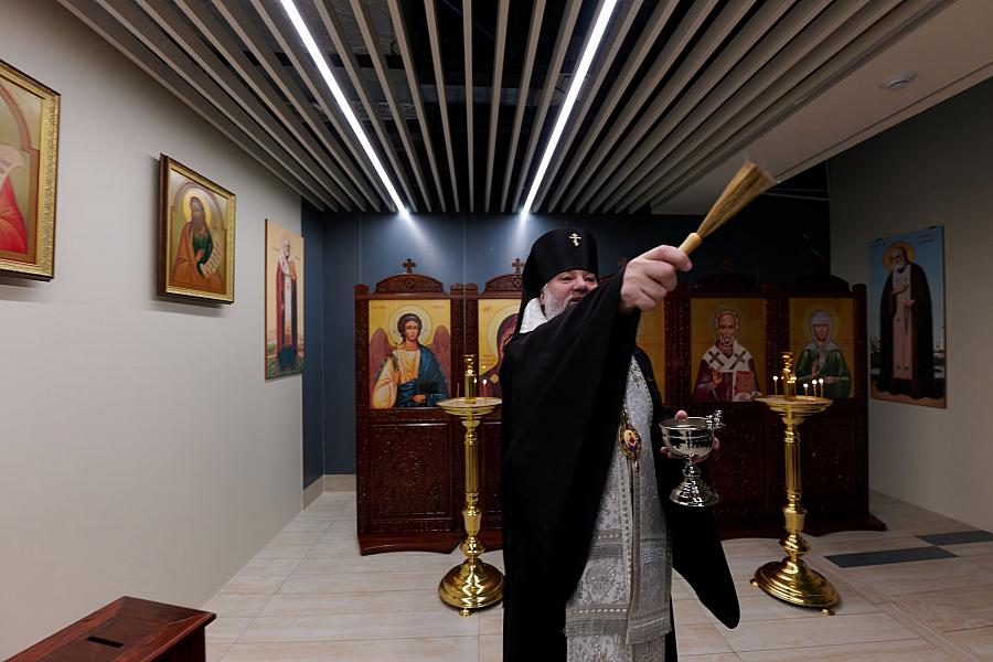 Чин освящения молитвенного пространства совершил архиепископ Южно-Сахалинской и Курильской епархии Никанор. К обряду присоединились верующие сотрудники воздушной гавани.