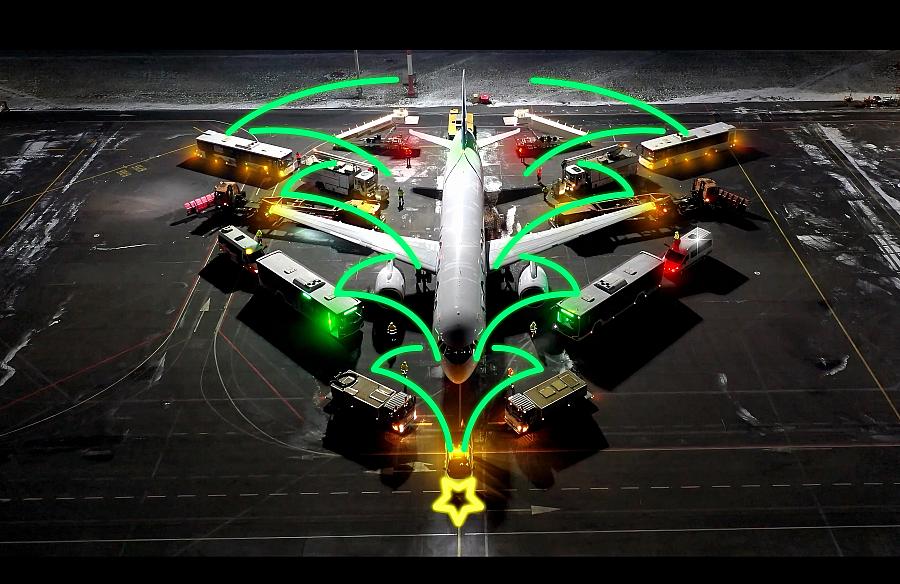 «Ветви» праздничного дерева сформированы перронной техникой и сотрудниками наземных служб аэропорта: тягачом, деайсерами, снегоуборочными машинами, пассажирскими автобусами и другим специализированным наземным транспортом.