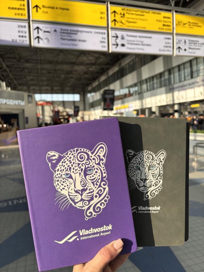 Первым в линейке корпоративной продукции с новым изображением дальневосточного леопарда, созданным при участии партнеров дизайн-агентства «Пилигрим» и национального парка «Земля леопарда» , стал ежедневник, выпущенный в двух фирменных цветах: фиолетовом и сером. В ближайшее время изображение редкой кошки появится и на других изделиях с фирменной символикой аэропорта.