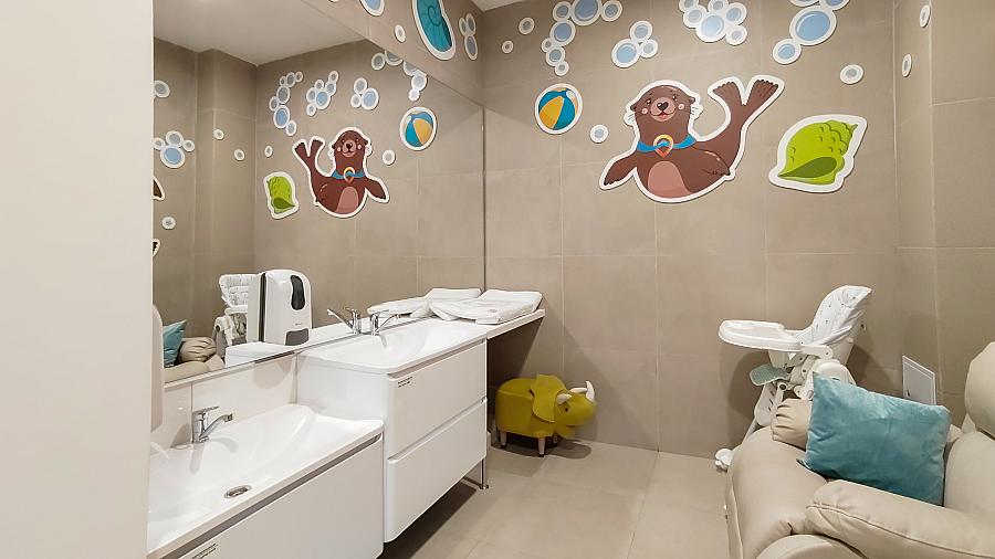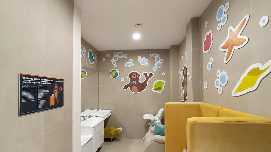 Небольшой зал оснастили мягкой мебелью, удобным креслом-качалкой для кормящих матерей, высоким стулом для ребёнка и двумя раковинами: обычной, которой могут воспользоваться взрослые, и с занижением – для юных пассажиров. Тут же установили кулер с питьевой водой, который подаёт её горячей и охлаждённой, и пеленальный стол с мягким матрасом. Полки для хранения наполнили одноразовыми пелёнками, влажными и сухими салфетками. Дополнительно сотрудники комплекса закупили подогреватели для детских бутылочек и компактный дорожный горшок со сменными пакетами.